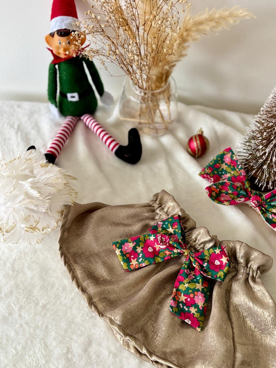 Cette jupette en polyester pailletée, ornée d'un noeud Liberty London et de son bavoir en Liberty assorti seront Idéal pour votre shooting de Noël et soirée du réveillon. Une tenue unique pour vos Minis qui ne passeront pas inaperçus.
