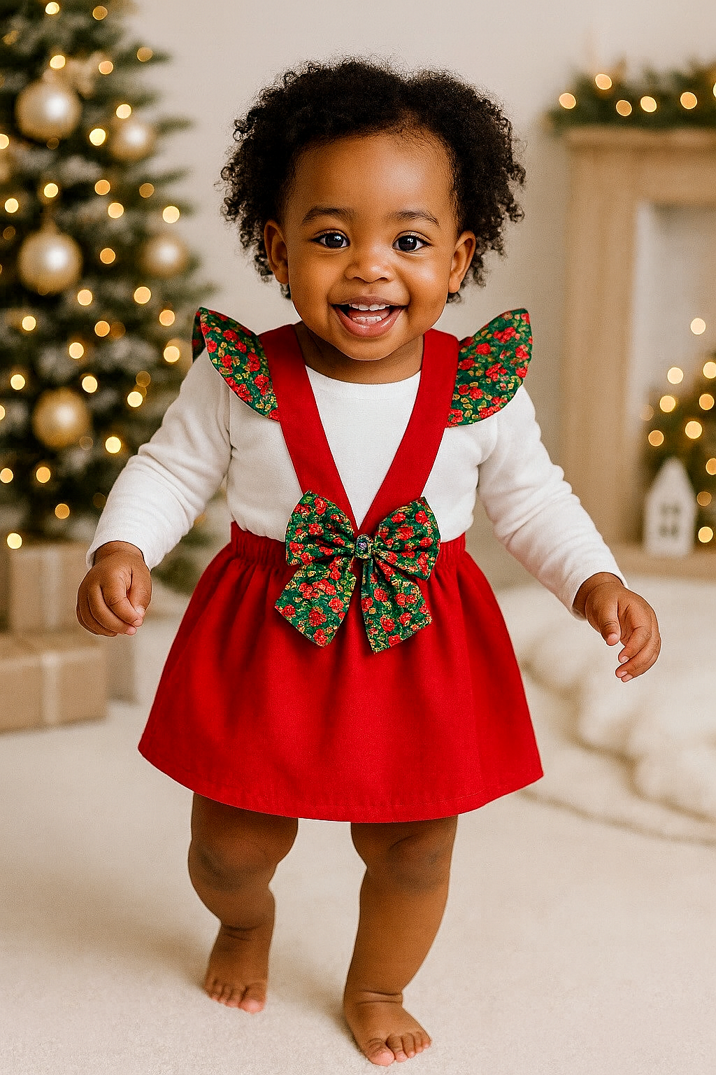 Cette jupette à bretelles à volants en Liberty ornée d'un noeud Liberty London sera idéal pour votre shooting de Noël et soirée du réveillon. Une tenue unique pour vos Minis qui ne passeront pas inaperçus.
